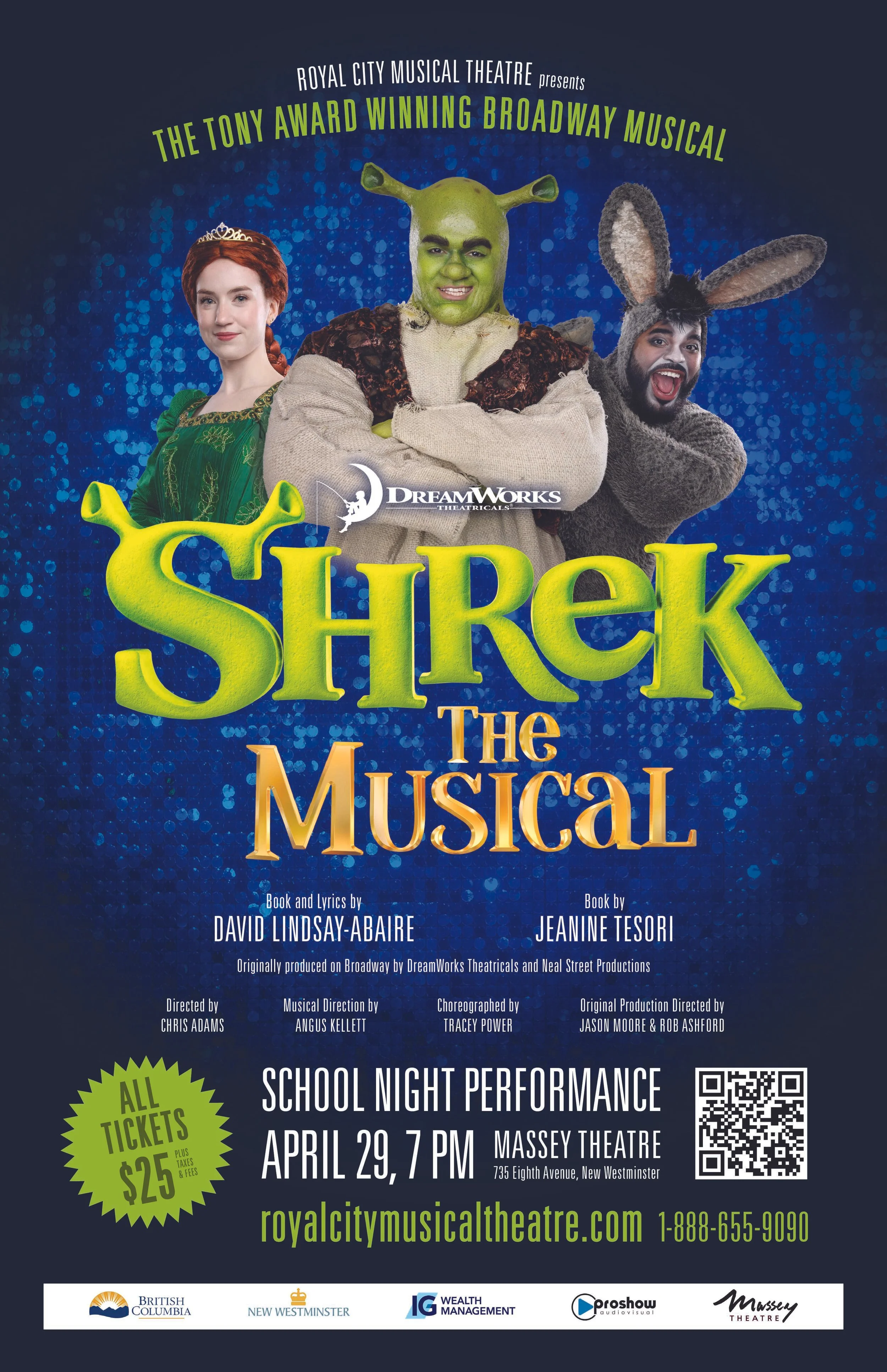 We are pleased to invite you and your students to attend Royal City Musical Theatre Society's upcoming production of Shrek the Musical at the Massey Theatre. A designated school performance has been scheduled for Wednesday, April 29 at 7:00 PM, and we would love to welcome schools from across the district for this special evening of live theatre.